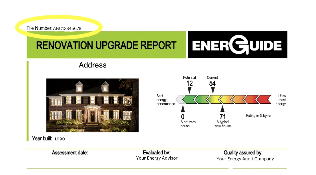 This file number will be found in the upper left hand corner of the Renovation Upgrade Report you would have received from your home energy assessment company following your pre-audit.