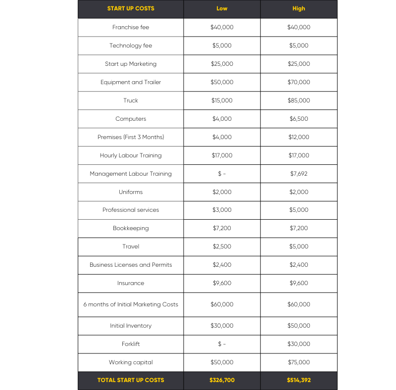 This figure includes a $40,000 franchise fee, as well as the costs for equipment, training, leasing a property, and other items outlined in the chart below